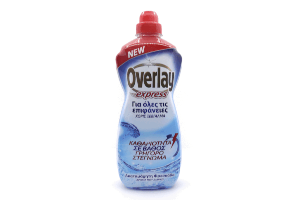 Το Overlay express για όλες τις επιφάνειες καθαρίζει γρήγορα και σε βάθος όλες τις επιφάνειες. Χάρη στην ειδική του σύνθεση αφαιρεί εύκολα ακόμα και την πιο επίμονη βρωμιά. Δεν αφήνει ίχνη και δε χρειάζεται ξέβγαλμα. Εγγυάται γρήγορο στέγνωμα και χαρίζει ευχάριστο άρωμα, σε όλο το σπίτι, που διαρκεί.